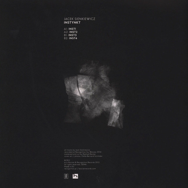 "Instynkt - oczekiwana płyta wydana przez nieoczekiwany tandem dwóch labeli: Bocian & Recognition. Cztery nowe autorskie utwory Jacka Sienkiewicza są jednocześnie esencją i antytezą wielu jego wcześniejszych dokonań, konfrontują słuchacza z trudno kategoryzowalną i zagadkową formą. W kreowanych przez Sienkiewicza indywidualistycznych dźwiękowych utopiach dają się usłyszeć echa klasyków muzyki elektronicznej (od Autechre do Xenakisa), jednak Instynkt jest przede wszystkim autonomicznym bytem, zdarzeniem prowokującym raczej do zadawania pytań niż udzielania ostatecznych odpowiedzi. Ta osobna i stworzona poza przestrzenią dominujących tendencji propozycja niewątpliwie zmartwi pesymistów roniących łzy nad końcem estetyk i utratą przez muzykę jej magicznej aury, a słuchaczy otwartych i śmiałych skłoni do dalszych poszukiwań i podróży w nieznane".