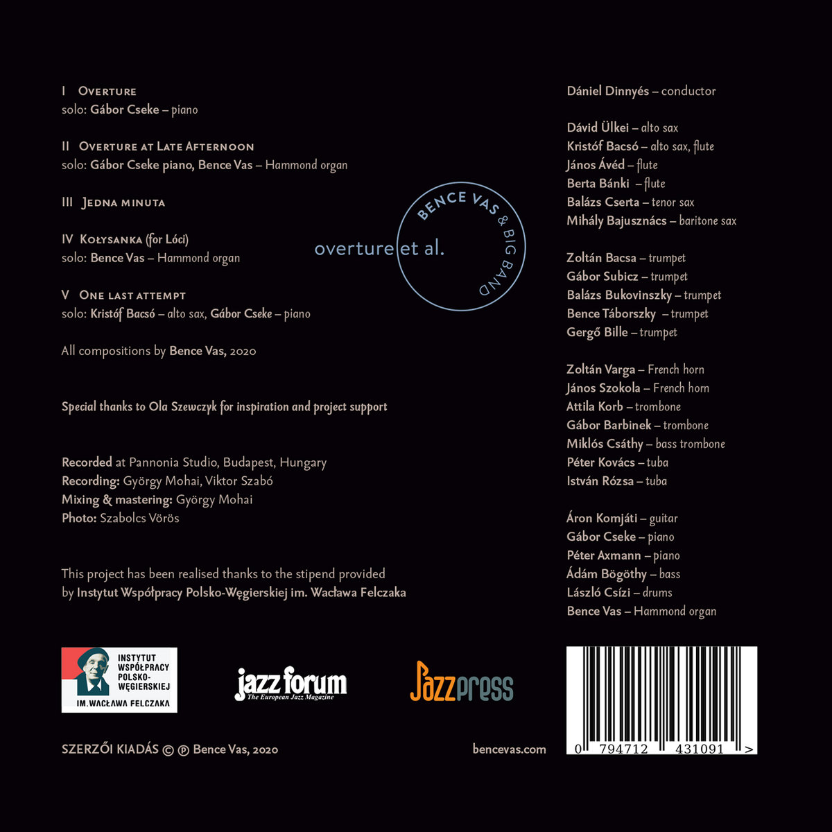 Większość utworów zawartych na płycie "overture et al." skomponowanych przez Bence Vas ma ścisłą strukturę muzyczną zainspirowaną studiowaniem podstaw techniki kompozytorskiej Bartoka. Stwarza to dość interesujące zderzenie z partiami improwizowanymi. Na płycie można usłyszeć rozszerzony jazzowy big band, któremu towarzyszą organy Hammonda. Nagrania zostały zrealizowane z udziałem czołowych muzyków węgierskiej sceny jazzowej i współczesnej muzyki klasycznej. Większość z nich to muzycy Modern Art Orchestra (MAO), którym dyrygował Dániel Dinnyés. Album "overture et al." został nagrany w słynnym Pannonia Studio - historycznym domu węgierskich produkcji filmowych i muzycznych w Budapeszcie.
