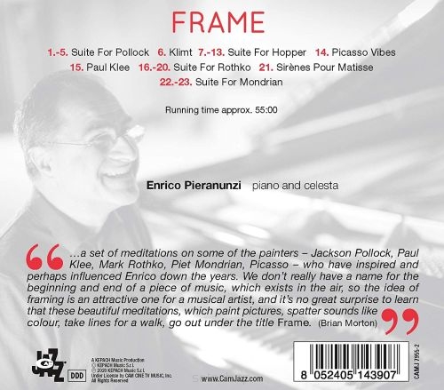 Artists are artists. They happen to work in colour, or with clay, or words, or musical sounds. But the key thing is that they are artists, first and foremost, and it is hardly surprising when one encounters them thinking in terms of another art form entirely. So it is with the latest CAM JAZZ release by piano maestro Enrico Pieranunzi, a set of meditations on some of the painters – Jackson Pollock, Paul Klee, Mark Rothko, Piet Mondrian, Picasso inevitably – who have inspired and perhaps influenced him down the years. We don’t really have a name for the beginning and end of a piece of music, which exists in the air, so the idea of framing is an attractive one for a musical artist, and it’s no great surprise to learn that these beautiful meditations, which paint pictures, spatter sounds like colour, take lines for a walk, go out under the title Frame. Pieranunzi has previously shown his devotion to movie makers and their musical collaborators. Here he shows a fresh new side of his complex but accessible cultural vision. Surveys show that we spend on average only seconds in front of even favourite paintings in a gallery. You’ll spend many happy hours listening to (gazing at) these beautiful piano pictures.