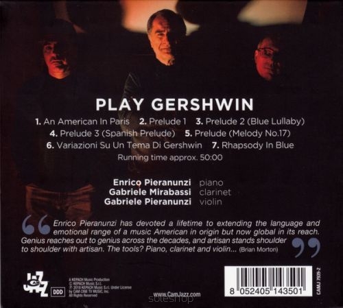George Gershwin thought that music channelled the thoughts, hopes and inspirations of people and their time, and in doing so, created something timeless. Now, on the 90th anniversary of Gershwin’s peerless score for An American In Paris, master pianist Enrico Pieranunzi brings seven of the great American’s compositions up to date, in bold new arrangements that see Gershwin’s expansive orchestrations reduced to just three instruments. Joining Pieranunzi on Play Gershwin are his violinist brother Gabriele [Pieranunzi] and clarinettist Gabriele Mirabassi. If the opening trill of Rhapsody In Blue is one of the defining sounds of 20th century music, here it is transformed completely, with much of the weight of the orchestra transferred to the orchestral piano of Enrico Pieranunzi, who plays four of Gershwin’s preludes as solo pieces and makes his own interpretation of an original Gershwin theme. The young American master, who was only in his 20s when he composed most of these remarkable works, said that inspiration alone was never sufficient for great music. It also required hard work and dedication. Enrico Pieranunzi has devoted a lifetime to extending the language and emotional range of a music American in origin but now global in its reach. Genius reaches out to genius across the decades, and artisan stands shoulder to shoulder with artisan. The tools? Piano, clarinet and violin...