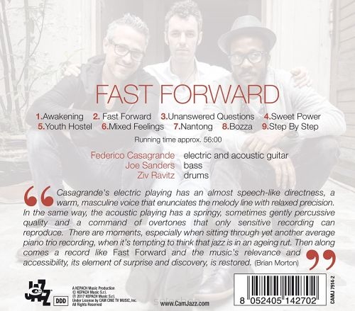 How much creative potential may a jazz trio unlock? Almost unlimited, if it is fascinating and multifaceted like that led by Federico Casagrande on guitar, who flawlessly works out an intriguing sonic journey. Nine stages worth exploring, nine original tracks by Casagrande that already hold an appeal during their enlightened, fertile compositional process and are shaped through diverse forms of interaction among the guitar, Joe Sanders’ bass (and double bass) and Ziv Ravitz’s drums. The instrumental intertwining proves beneficial: an actual ad-libbed treasure trove of themes, harmonies and rhythms, an insightful expressive power pursued forcefully and consistently, even in the variety of ensuing moods. An amazingly passionate, refined acoustic guitar-playing can be listened to in two small gems of artistry, Awakening and Step By Step, the opening and closing tracks, respectively. Between Fast Forward in 7/4 time, that conjures up Led Zeppelin-like rock vibes, and the dreamlike Nantong, in which guitar improvisation is supported by a dense, rolling harmonic and rhythmic background, you will also find seemingly calm tracks with a soft pace but strong harmonic tension. And you may also be surprised by the faint Latin hint in Bozza or the gradually pressing Mixed Feelings. The common thread in this unique journey is unpredictability: the unpredictability of Jazz played by new generations, an enchanting blend of visionary imagination, with even magnificent passages, and strict musical training.
