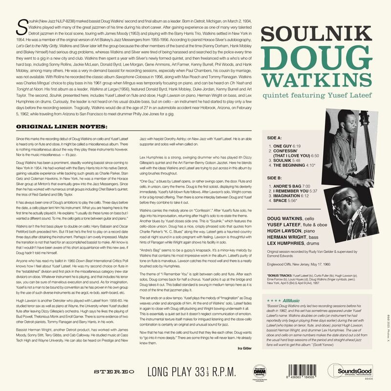 Jazz bassist Doug Watkins died in a car accident in 1962 at the age of 27. However, prior to his early demise, he recorded dozens of wonderful sessions with some of the greatest jazzmen of his time, among them Sonny Rollins, Art Blakey’s Jazz Messengers, and the Horace Silver Quintet. Soulnik marked his second and final album as a leader, and features Watkins on cello instead of bass, and in the company of the great Yusef Lateef. 180-gram VIRGIN VINYL LIMITED EDITION. The Complete Album + 2 Bonus Tracks.