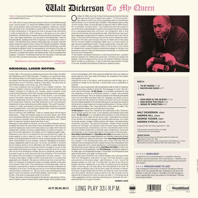 Dickerson zadebiutował w roku 1961 płytą „This Is Walt Dickerson!”, wydaną w New Jazz label/Prestige Records, dla której wibrafonista nagrał w sumie cztery albumy. Ich ukoronowaniem była właśnie płyta "To My Queen", nagrana kwartecie z pianistą, do którego jak ulał pasuje przydomek giganta jazzu - mowa oczywiście o Andrew Hillu. Sekcja rytmiczna jest także godna pozazdroszczenia - na kontrabasie George Tucker, za perkusją Andrew Cyrille.