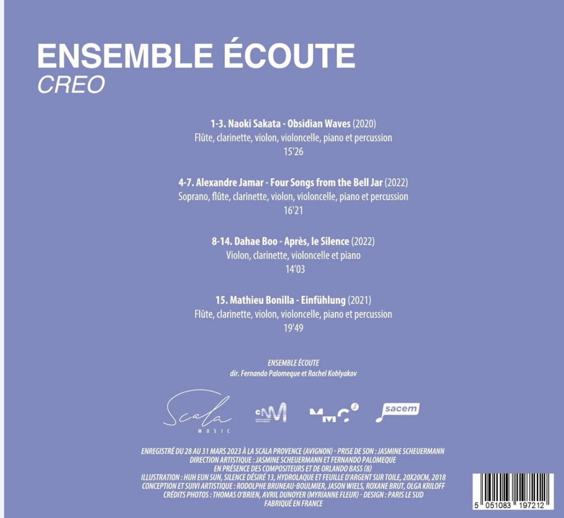 The first album from a young ensemble is both an achievement and a calling card. For several years, conductor Fernando Palomeque has brought together performers, composers and visual artists to question the contemporary. Most of the composers recorded here have been in residence with the Ensemble listening to record custom works. An international panorama emerges, from Europe to Japan, with subtle and poetic scores coming straight from the spectral school and Gérard Grisey.