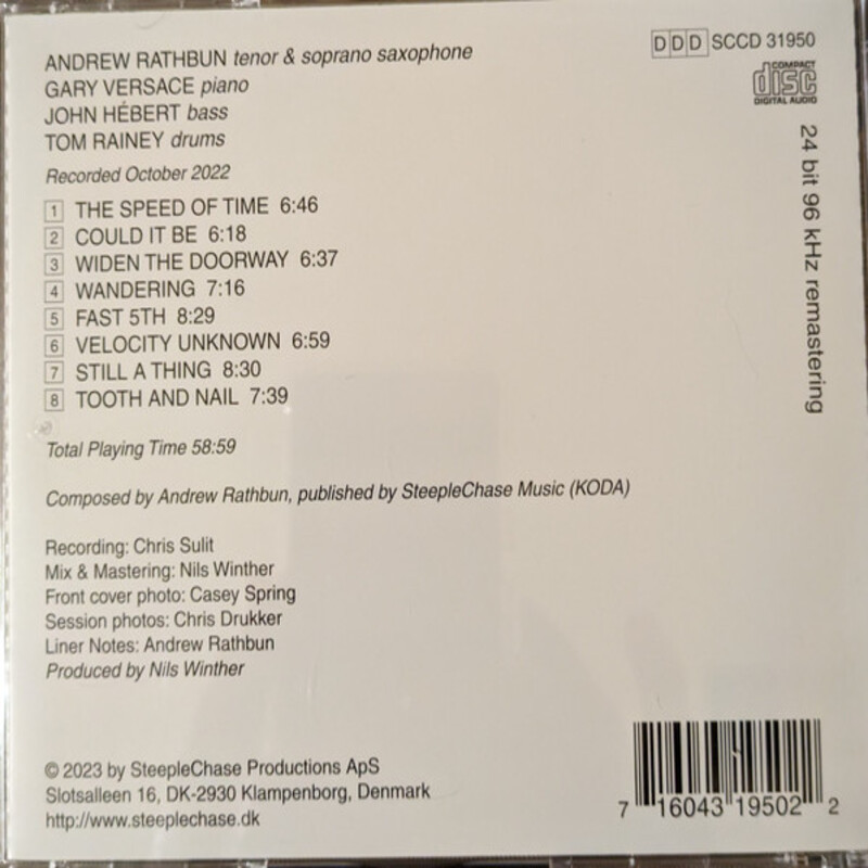 On all his 10 SteepleChase albums including this quartet recording Andrew Rathbun the composer-arranger is the major component giving each album a distinct musical as well as philosophical concept. 'The Speed Of Time' is about his unique perception of time during and after the pandemic era, which he describes eloquently in his liner notes.