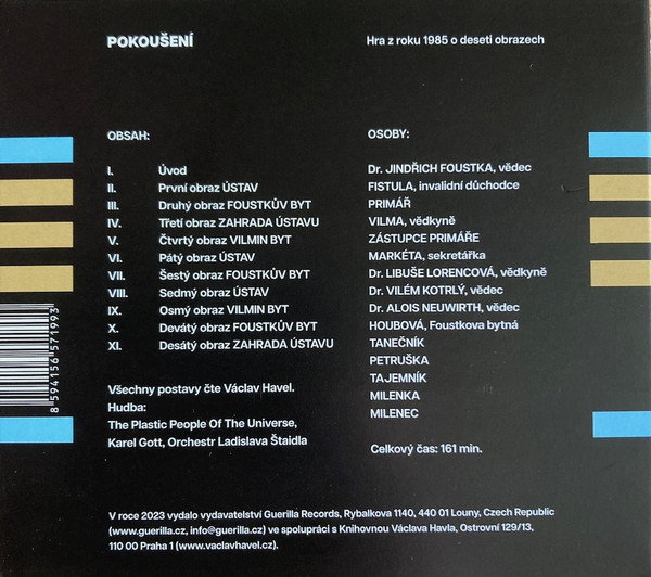 Part of the cover is a copy of his letter to Pavlo Landovská, in which the author explains the origin of the play and a reprint of a review of this play by Ivan Jirous, which was published in the illegal Vokn No. 11. A particularly baked bonus is the final piece, sung by a 42-times golden nightingale from Prague.