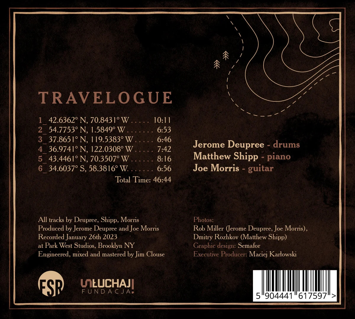 Legendarny pianista Matthew Shipp, jeden z najwybitniejszych improwizatorów Joe Morris i fantastyczny perkusista Jerome Deupree znani z kultowego zespołu Morphine razem! w nagraniu "Travelogue" wydawnictwa Fundacji Słuchaj!