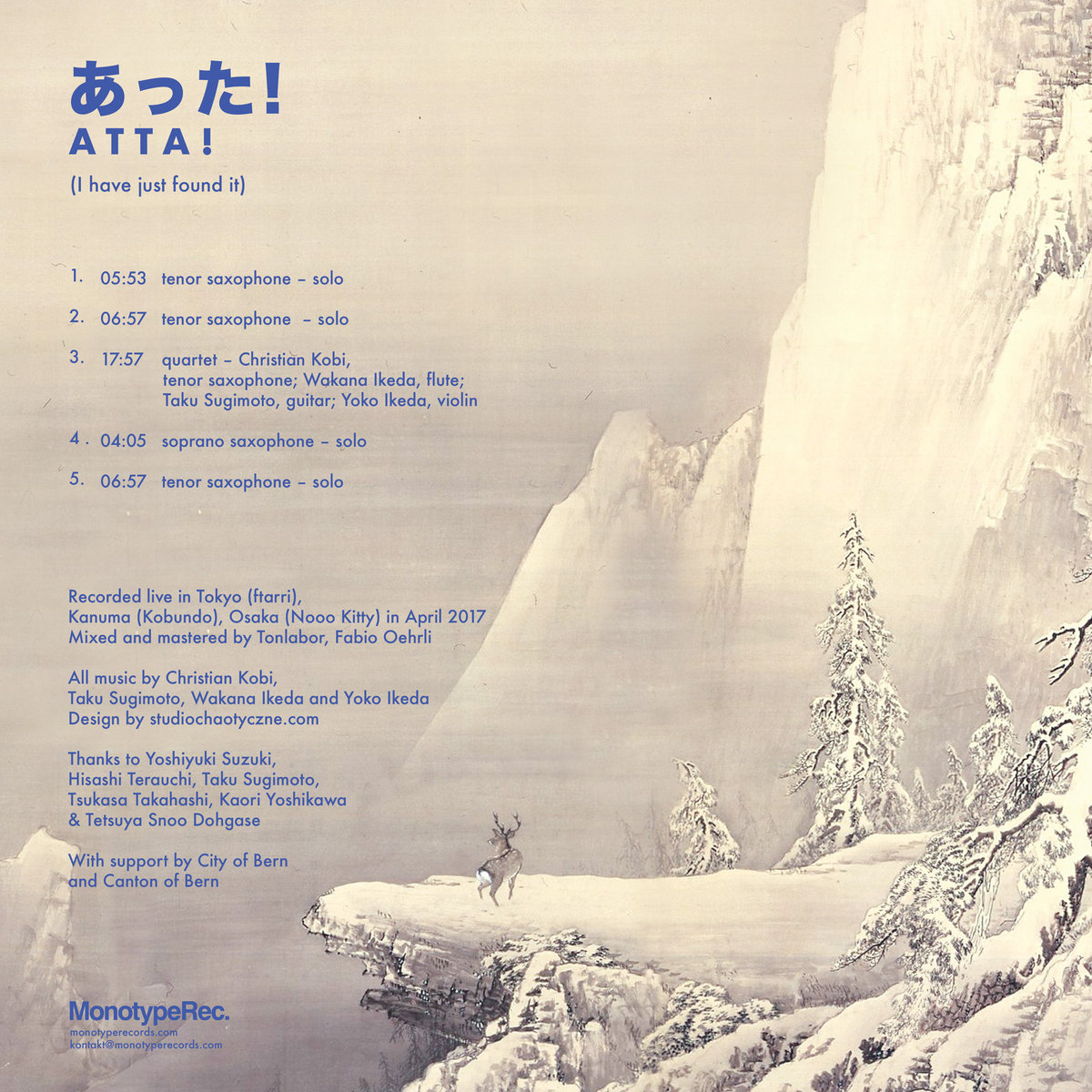 Music By – Christian Kobi, Taku Sugimoto (tracks: 3), Wakana Ikeda (tracks: 3), Yoko Ikeda (tracks: 3) Recorded live in Tokyo (ftarri), Kanuma (Kobundo), Osaka (Nooo Kitty) in April 2017.