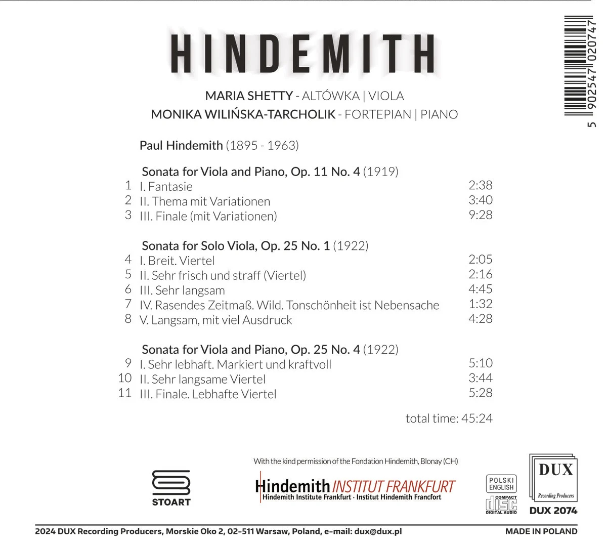 Album zawiera nagrania trzech sonat Paula Hindemitha, który rozpoczynał swą karierę kompozytorską pozostając pod wpływem wciąż wtedy aktywnego twórczo Claude’a Debussy’ego, a kończył w zupełnie innej rzeczywistości lat 60. XX wieku, w erze eksperymentów sonorystycznych, formalnych i harmonicznych. Był także znakomitym altowiolistą, stąd znacząca liczba jego utworów dedykowanych altówce. Pierwsza z sonat posiada jeszcze romantyczny charakter, urzeka pięknem i bogactwem motywów, pozostałe dwie mają znacznie bardziej współczesne brzmienie. Wszystkie stawiają wysoko poprzeczkę wykonawcom, zarówno w kwestii umiejętności technicznych, jak i uchwycenia struktury dzieła. Maria Shetty, altowiolistka związana z krakowską akademia muzyczną oraz NOSPR, kameralistka, współzałożycielka Messages Quartet oraz pianistka Monika Wilińska-Tarcholik tworzą pełen porozumienia duet. Prowadzą słuchacza przez skomplikowaną, pełną znaczeń materię muzyczną z dużą wrażliwością na niuanse barwowe i stylistyczne oraz wirtuozowskim polotem.