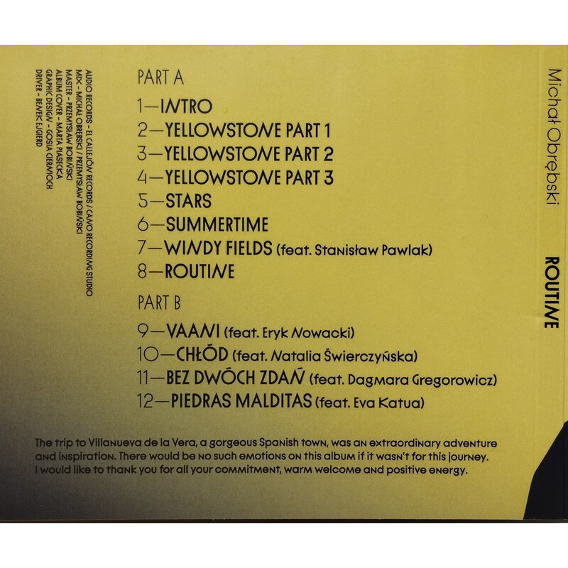 Michał Obrębski to kompozytor, wykonawca i producent muzyczny. W lutym 2025 roku ukaże się jego czwarty album studyjny Routine, nagrany w Hiszpanii i Polsce. Płyta powstawała przez dwa lata podczas koncertów w różnych krajach, gdzie artysta testował nowe utwory i współpracował z międzynarodowymi muzykami, m.in.. Stanisławem Pawlakiem, Natalią Świerczyńską, Dagą Gregorowicz i Evą Katuą.