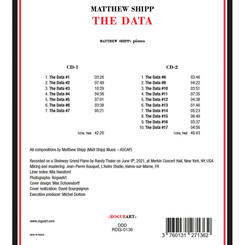 Recording in the Merkin Concert Hall on a Steinway Grand Piano, New York pianist Matthew Shipp's seventeen numbered tracks of "The Data" takes listeners through a virtual history of jazz and contemporary improvisation, from beautifully lyrical moments to rapidly complex matrices of expression, balancing his approaches into an absorbing and rewarding album.