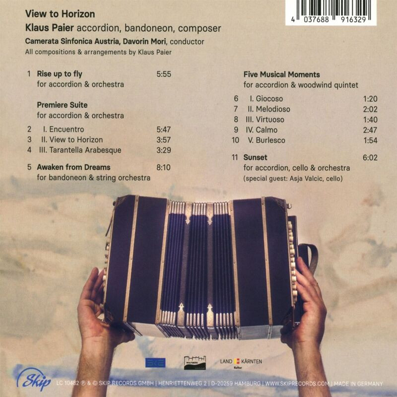 "In his first orchestral project, Paier is now making this a reality with 22 string and wind players from the 'Camerata Sinfonica Austria'. The orchestra, co-founded in 2017 by pianist and conductor Davorin Mori and already established through outstanding performances at important festivals, sees itself as a soloist ensemble and is therefore the ideal orchestra for Paier's demanding compositions. In View to Horizon, they work together on five pieces, including the multi-part Premiere Suite and Five Musical Moments, to create an arc that unwinds like a feature film. From the brilliant Rise up to fly, which sweeps every listener into the action, to the voluptuous Awaken from Dreams and the opulent Sunset, Paier masterfully combines his soloist part with the various orchestral forces to create a sound adventure integrated into a stringent dramaturgy. From pensive lyricism to a wild storm of melodies, Paier awakens all emotions in the listener, View to Horizon is truly 'great cinema', as Oliver Hochkeppel explains in the liner notes.