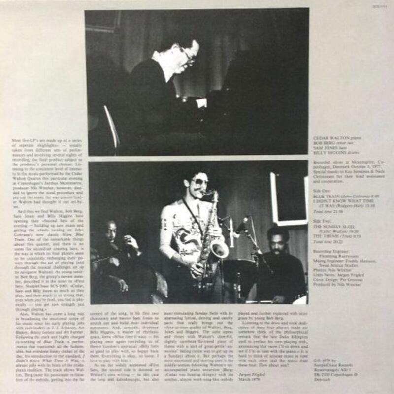 A richly and interestingly textured arrangement of John Coltrane's "Blue Trane" opens SECOND SET. Walton launches into his solo, doubling Sam Jones' Horace Silver-flavored Latin bassline. Walton's playing is expansive and conceptually tight, superimposing an easy blues swing over the groove. A lovely, medium-tempo version of Richard Rodgers "I Didn't Know What Time it Was" follows. Cedar's touch is incisive without being unpleasant. While the understated rhythm section work by Jones and Billy Higgins is also fine, the young Bob Berg, perhaps too influenced by Michael Brecker's pentatonic approach, doesn't quite catch the mood of the tune. SECOND SET ends with the multi-sectioned "Sunday Suite," a Walton original. Higgins injects spaces and sonic beauty into his intelligently crafted solo, getting finely sculpted sounds out of his drums and cymbals.