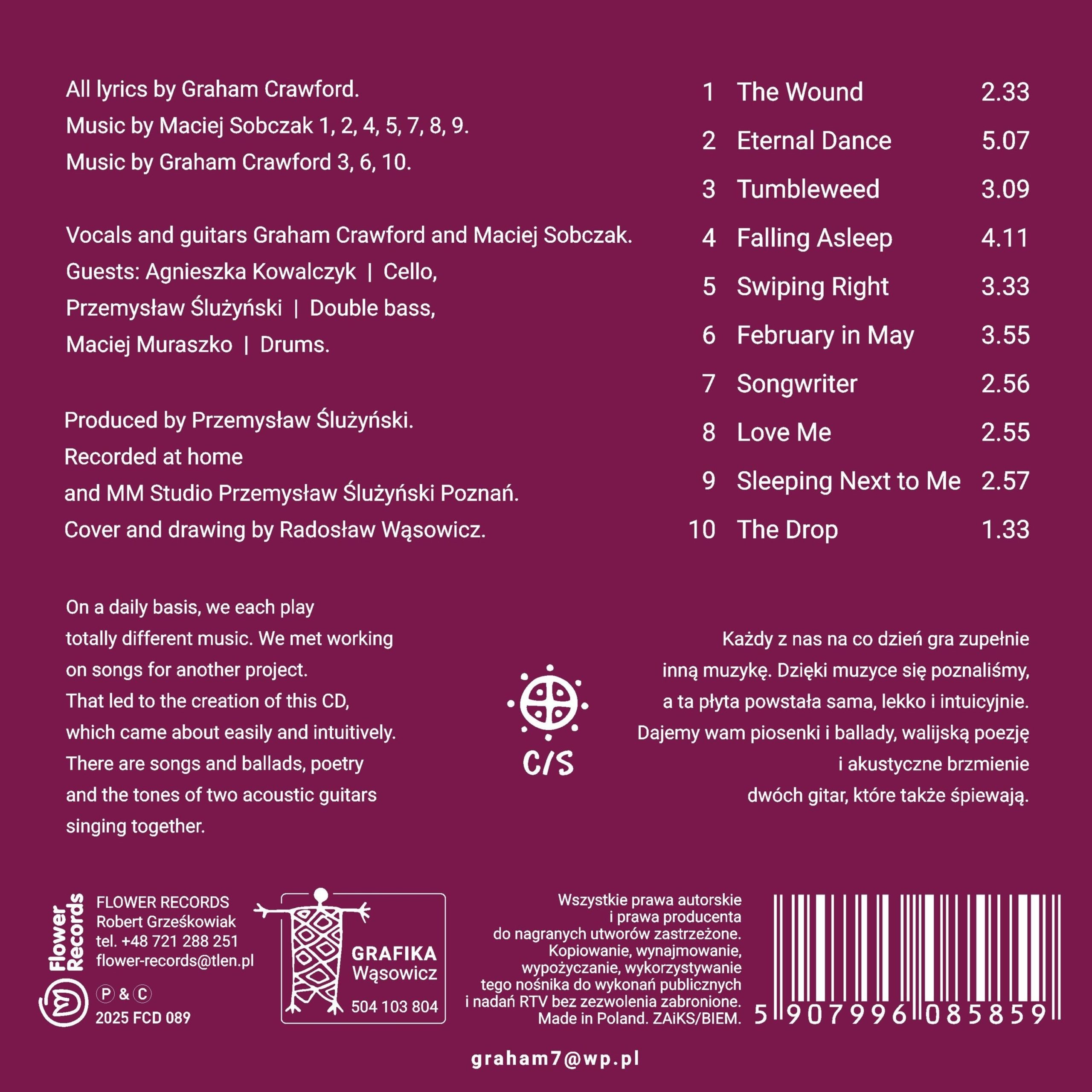 Debiutancka płyta „Tumbleweed” duetu Crawford / Sobczak, która ukazuje się właśnie nakładem Flower Records, powstała „sama, lekko i intuicyjnie”. Jest zdecydowanie akustyczna i gitarowa. Piosenki, ballady i walijska poezja ubrana w folkowe nuty. Większość kompozycji to dzieło Macieja Sobczaka, natomiast teksty w całości napisał Graham Crawford.