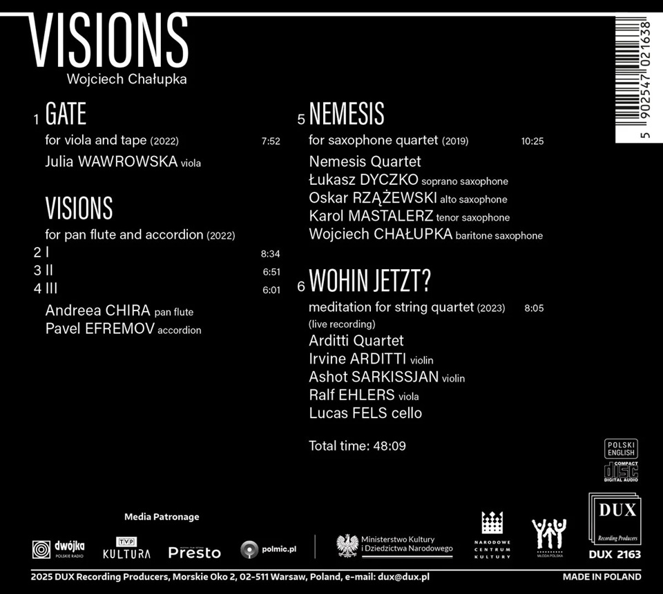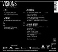 Płytę otwiera Gate na nietypową obsadę altówki i taśmy, składającej się z przekształconych dźwięków altówki oraz dzwonów, a wyróżniającym elementem utworu jest śpiewna narracja instrumentu. Tytułowe Visions na równie zaskakujący skład instrumentalny fletni Pana i akordeonu to dzieło niezwykle wirtuozowskie w skrajnych ogniwach, w którym pobrzmiewają dalekie echa rumuńskiej muzyki ludowej. Nemesis na kwartet saksofonowy, zwycięska kompozycja z konkursu im. T. Bairda to zderzenie rozproszonych, sennych myśli z wybuchowymi fragmentami pełnymi napięcia. Wohin jetzt? na kwartet smyczkowy to próba odpowiedzi na pytanie Quo vadis? wyrażona w formie wirtuozowskich, pozornie improwizacyjnych motywów na pograniczu medytacji i szaleńczych zrywów.