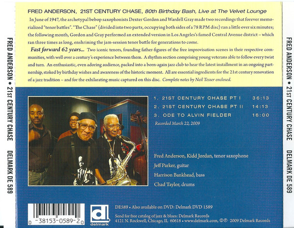 Chicago tenor saxophone legend and proprietor of the longest standing and most adventurous avant garde jazz club in Chicago, Fred Anderson celebrated his 80th birthday in March and Delmark was there to capture it. All 3 of Fred's earlier Delmark albums were live at the Velvet but the excitement level here is unmatched and the show was sold out weeks in advance. Fred is joined by Kidd Jordan, tenor saxophone; Jeff Parker, guitar; Harrison Bankhead, bass; Chad Taylor, drums. DVD contains PCM 24 bit/48kHz stereo audio plus Dolby and DTS 5.1 Surround Sound, one bonus track featuring legendary bassist Henry Grimes, and a Fred Anderson commentary track. Also available: On The Run (Delmark 534); Back at The Velvet Lounge (549); Timeless (568, DVD 1568).