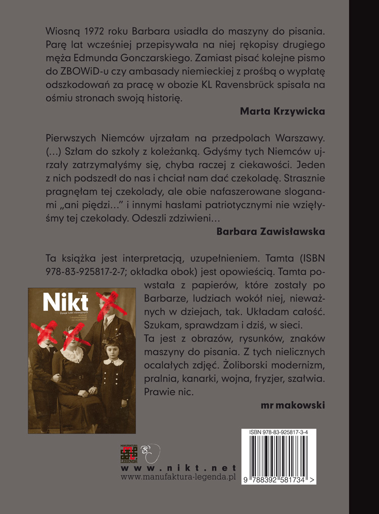 Lata 30. Barbara, dziecko-Nikt. Rodzice: prasowaczka, murarz. Oni, inni – po Wielkiej Wojnie, po zaborach – budują WSM, zakładają Pralnię Spółdzielczą, tworzą nowy kraj. Przychodzi nowa wojna, rodzice giną w Powstaniu, jedno zaraz po drugim. Nie: nie walczą, to starzy ludzie.