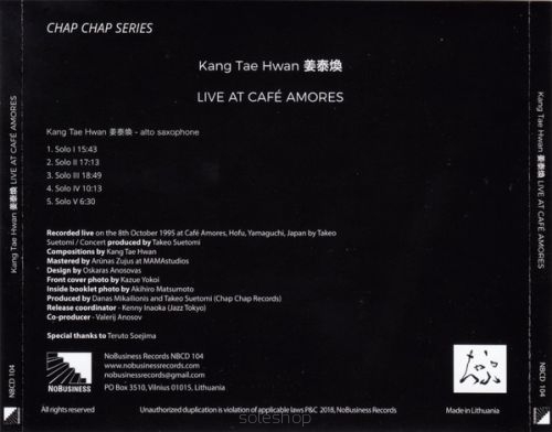 South Korean reedman Kang Tae Hwan is one of the foremost exponents of solo saxophone in the Far East. While he has featured in groups, notably Ton Klami who can be heard on Prophecy Of Nue (NoBusiness, 2017), his conception is so singular that it may be best appreciated in undiluted form. Which makes Live At Cafe Amores a prime exhibit to further awareness of his extraordinary art. It's another in the Lithuanian label's ongoing series of unreleased Chap Chap label recordings licensed from Japan. His combination of multiphonics, overtones and sustained circular breathing recalls some of AACM reedman Roscoe Mitchell's solo outings, while he also sometimes suggests a more serene Evan Parker.