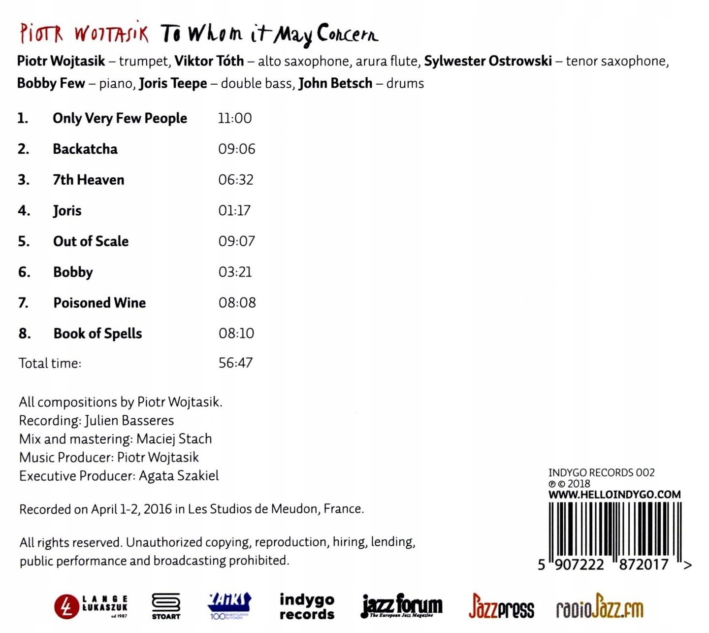 Płyta „To Whom it May Concern” jest swoistym podsumowaniem 30-letniej działalności muzycznej Piotra Wojtasika. Na płycie pojawiają się muzycy, z którymi współpracował na przestrzeni lat w różnych składach. Wojtasik zaprosił do współpracy: Viktora Tótha (Węgry), Sylwestra Ostrowskiego, Bobby’ego Few (USA, Francja), Jorisa Teepe (Holandia), John’ego Betscha (USA, Francja). Kompozycje zostały napisane specjalnie z myślą o trasie koncertowej z legendą światowego jazzu – Bobby’m Few. Nagranie zrealizowano w Les Studios de Meudon we Francji. Na płycie znajduje się osiem autorskich kompozycji Piotra Wojtasika.