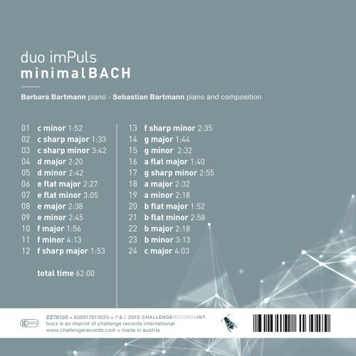 The new project "minimalBACH" by piano duo "duo imPuls" is dedicated to the Preludes by Johann Sebastian Bach from the first volume of the Well-Tempered Clavier, which are placed in the new, exciting listening context of minimal music". The aim of composer and pianist Sebastian Bartmann is to use "minimalBACH" to focus on the musical essence and effects of the individual Preludes by J.S. Bach, to extract their radiance and to shed new light on them with the techniques of minimal music.