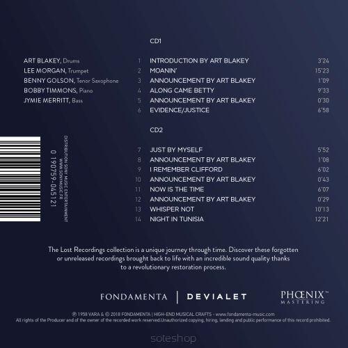 Art Blakey had just turned thirty-nine. He was “Bu” to those who knew that late in the 1940s he had taken the name of Abdullah Ibn Buhaina. In 1954, he had co-founded the Jazz Messengers with pianist Horace Silver, but now he led the quintet single-handedly, identifying the most outstanding talents, mentoring them, taking them to the top. The group of course continued to expand until late in the 1980s to include other artists – as talented as they were diverse – such as Wayne Shorter, Clifford Brown, the Marsalis brothers and Keith Jarrett. But already in 1958, the ensemble was inspired, imbued with confidence, crowned with success, and most importantly, original. Pianist Bobby Timmons had just composed the emblematic “Moanin’” and saxophonist Benny Golson, his famous “Along Came Betty”, songs that the Jazz Messengers interspersed with the compositions of their illustrious fellow musicians: Thelonious Monk, Charlie Parker and Dizzy Gillespie. The creme de la creme of the jazz world was on stage that evening, their performance fallen into oblivion until this recording.