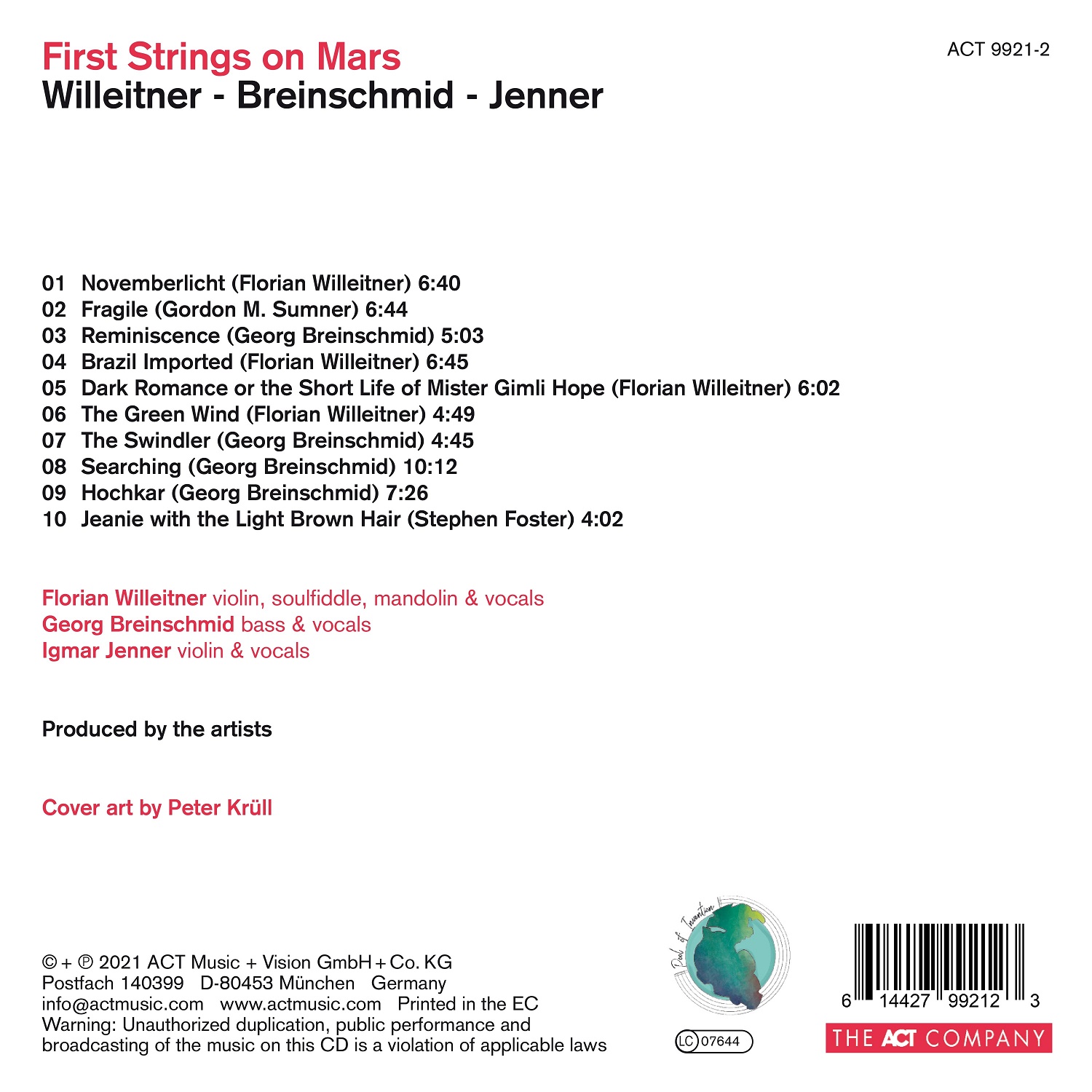 Wiedeński projekt First Strings on Mars mieliśmy okazję poznać podczas koncertu w ramach poznańskiego Enter Enea Festival w roku 2018, kiedy to trójka tworzących go muzyków przedstawiła widowiskowy i pełen wręcz ekwilibrystycznej wirtuozerii program oparty na muzyce klezmerskiej. W roku 2021 trafi do nas album złożony z nagrań zespołu zarejestrowanych w Austrii, Niemczech, oraz podczas wspomnianego koncertu w Polsce. Projekt powstał z inicjatywy kontrabasisty Georga Breinschmida, artysty który w ramach Enter Enea Festival 2016 wystąpił w składzie formacji radio.string.quartet.vienna. Muzyk pozyskał do składu dwóch znakomitych skrzypków: wywodzącego się z tej formacji Igmara Jennera, oraz znanego polskiej publiczności z II Międzynarodowego Jazzowego Konkursu Skrzypcowego im. Zbigniewa Seiferta, Floriana Willeitnera. Na płycie znajdziemy pełne, nie tylko zapierającej dech w piersi wirtuozerii ale i osobliwego humoru i pomysłowych pastiszy utwory, oparte na solidnym warsztacie tria smyczkowego. Poza kompozycjami Willeitnera i Breinschmida, w programie albumu znajdziemy też udana przeróbkę przeboju Stinga: "Fragile".