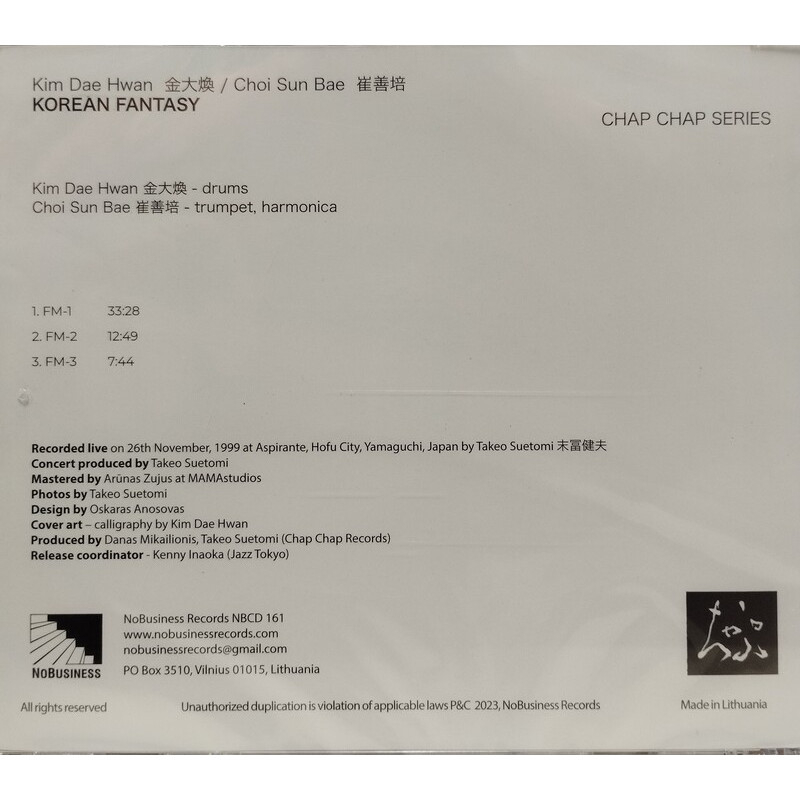 Live performance of two of the most important South Korean free music players Kim Dae Hwan on drums and Choi Sun Bae on trumpet. Recorded live on 26th November, 1999 at Aspirante, Hofu City, Yamaguchi, Japan by Takeo Suetomi.