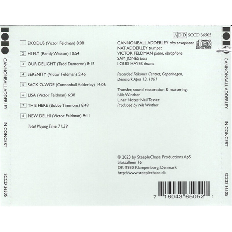 Falkoner Centret shortly after a modernist architectural make-over hosted a burgeoning young quintet headed by Cannonball Adderley in the spring of 1961. Though it was before they made their big splash on the soul-jazz front with hit tunes like Unit 7, Jive Samba, Cannonball’s successful 18-month tenure with Miles Davis put extra allure to the band. Previously unissued recording features English-born pianist Victor Feldman whose compositions make up the majority of repertory on this disc.