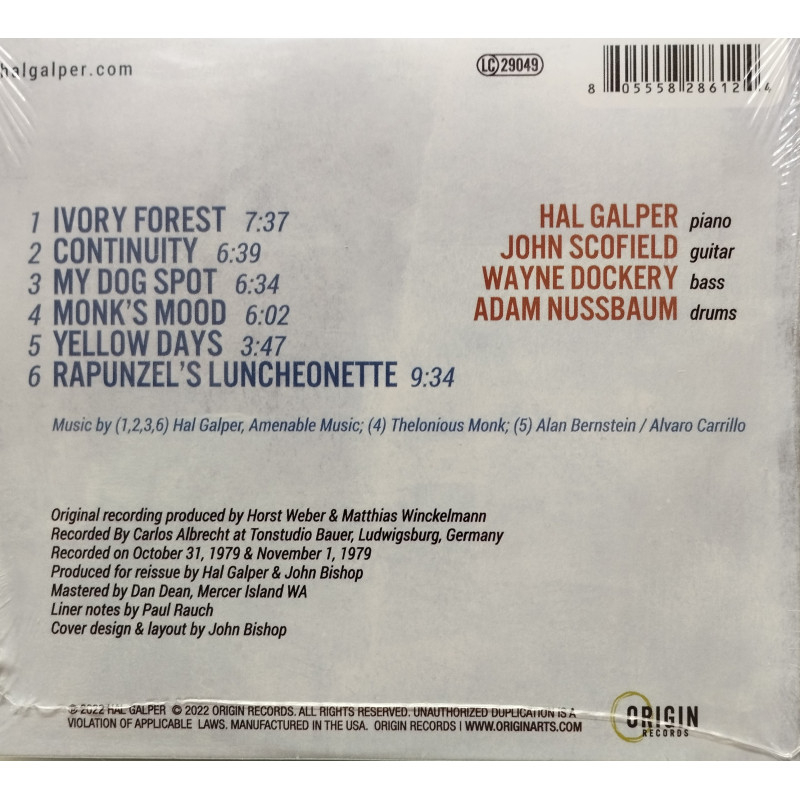 During a rich musical period in the late '70s with many performances around New York City and two European tours together, pianist Hal Galper and guitarist John Scofield recorded a pair of legendary albums that demonstrated the well grounded paths they were on, their concepts coalescing in a hub of scorched earth intensity. Scofield's Rough House was followed by Galper's Ivory Forest recorded in October 1979, both originally on the German Enja label and with Adam Nussbaum on drums. Now 40+ years later, and the legacy set with countless thousands of musicians inspired to follow in their steps, the sounds remain modern and vital.