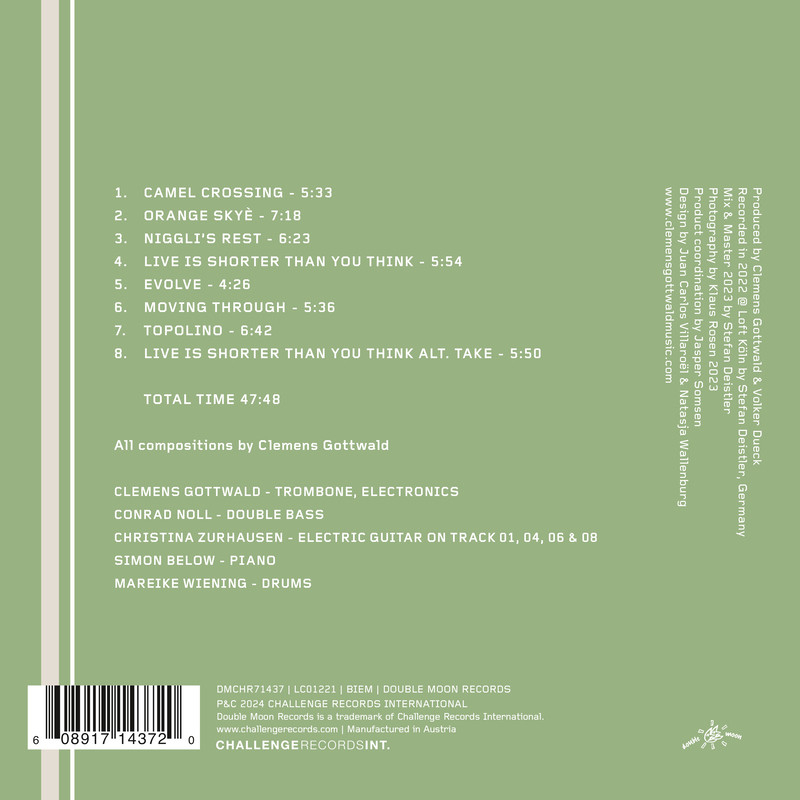 Gottwald and his quartet Prisma – with the decisive addition of guitarist Christina Zurhausen – play seven compositions by the trombonist (the ingenious "Live is Shorter Than You Think" twice), and the album is opened by the musical tantrum "Camel Crossing". "Enraged, I stood alone in my small apartment in 2017," Gottwald recalled "and thundered the entrance motif into my trombone. The rest of the melody just flowed out of me afterward. The band contributed to sorting out this chaotic song." No small thing for the bassist Conrad Noll (he is an old duo partner of the trombonist), the pianist Simon Below (whom Gottwald met during his studies in Cologne) and the drummer Mareike Wiening. At the same time, Christina Zurhausen is a guest here and on three other songs, whom Gottwald asked to participate for a very specific reason. "She doesn’t come primarily from jazz, but from grunge," the bandleader explained. "That suited me, because I didn't want a typical jazz guitar, but someone who is rockier on the road." This is a big understatement for the guitarist's sharp-edged and hard-hitting sound, which is able to charge a song electrically at any time and take it away toward avant-garde garage rock. Even a song title like "Niggli's Rest" is a mystery, because everyone knows that the Swiss drummer is "alive and kicking". "'Niggli's Rest‘ is dedicated to a cat that my mother christened after Lucas Niggli," Gottwald explained. “That cat died. This song wants to describe her path, her struggle, because in the end death e....... more