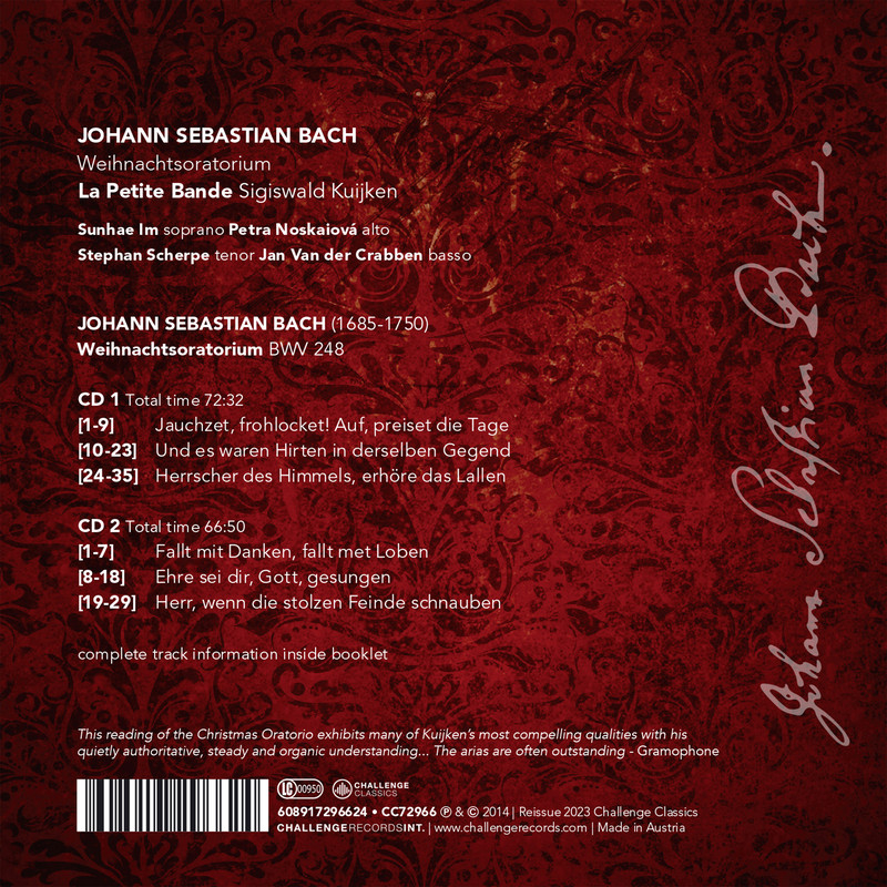 The Christmas Oratorio is a series of 6 separate cantatas, collectively relating the story from Christmas through to Twelfth Night. Bach wrote the work in Leipzig in 1734 and 1735 for Christmas Day (I), Boxing day (II), the third day of Christmas (III), New Year (IV), the Sunday after New Year (V) and Twelfth Night (VI). As with the Passions, the texts here are drawn from three sources: (1) the evangelical texts (primarily Luke and Matthew) intoned by the Evangelist (tenor) as recitatives, (2) chorales from the Lutheran tradition and (3) free texts for arias and some choral passages, written by the poet Picander.