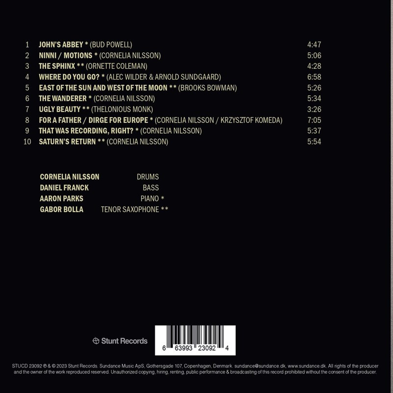 Ze szwedzką perkusistką Cornelią Nilsson po raz pierwszy zetknąłem się na płycie "Mind the Gap of Silence" nagranej przez Martina Küchena i Landæus Trio (Clean Feed, 2020). Pomimo generacyjnego dystansu dzielącego ją do Martina Küchena - lidera Angles i Mathiasa Landausa, doskonałego muzyka sesyjnego, ale też lidera kilku formacji, Cornelia Nilsson zaprezentowała się wspaniale. W międzyczasie trafiła do zespołów Tima Hagansa, Kenny'ego Barrona i Rona Cartera. Stypendium Bengta Säve-Söderbergha w 2019 r., stypendium Monica ZeƩerlund’s Memorial Fund w 2020 r. oraz nagroda Tivoli Jazz Prize w 2021 r. potwierdziły potencjał szwedzkiej jazzmanki.