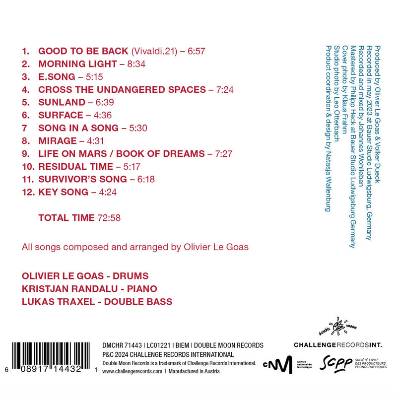 "The album should have been recorded years ago, but the coronavirus pandemic threw a wrench in our plans," le Goas sighed. In May 2023, the three musicians finally went to the legendary Bauer Studios in Ludwigsburg to record twelve songs that the drummer composed especially for this line-up. Tricky meters ("Good to be Back", "Life on Mars/Book of Dreams", "Mirage") play just as important a role as songs inspired by folk songs ("E. Song", "Key Song") and multithematic songs ("A Song in a Song", "Morning Light", "Cross the Undangered Species").