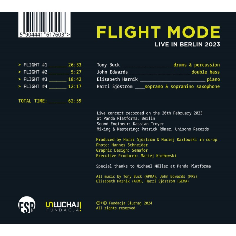 Legendary saxophonist and improviser Harri Sjostrom knows how to build bands. This has certainly been the case since the Lifting The Bandstand album, but back then the great Cecil Taylor was the leader. This is certainly one of the many lessons Harri Sjostrom has learned from the brilliant pianist and leader. He has since given evidence of this an endless number of times. The latest band he has established is a quartet with Elisabeth Harnik, arguably one of the most important pianists in improvised music today, the great John Edwards on bass and percussionist and co-founder of the legendary band The Necks, Tony Buck.Let's move to Berlin, sit comfortably in the armchairs, we are in for a night flight, the likes of which do not happen often!