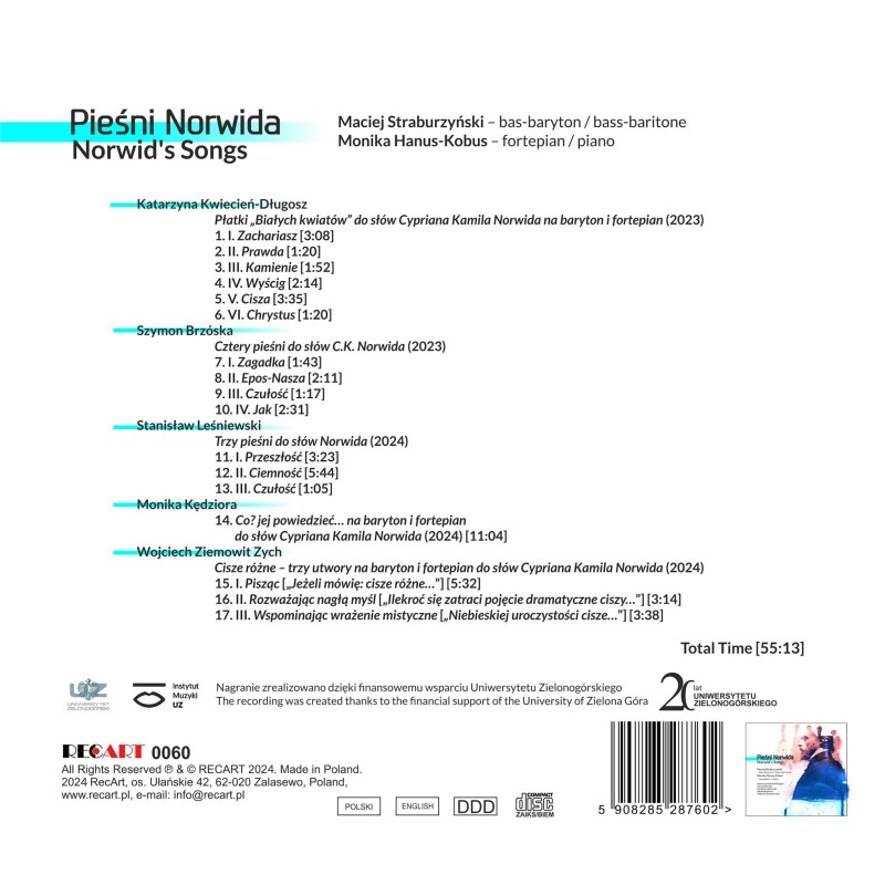 The album contains five world premieres for bass-baritone and piano by five Polish composers of the young and middle generation. All the pieces – written especially for the performers – were inspired by the prose and poetry of Cyprian Kamil Norwid.
