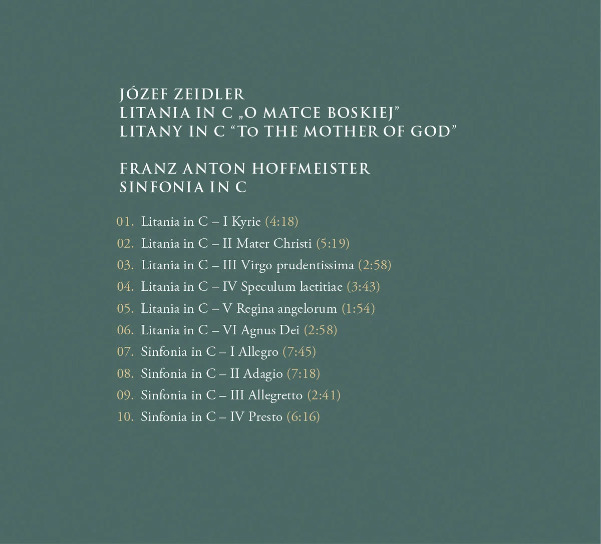 The CD contains concert recordings made during the 18th edition of the Musica Sacromontana festival at Święta Góra in Gostyń. Traditionally, the festival programme consisted of works from local archives, including those by Józef Zeidler and Anton Hoffmeister. Both are among the so-called little masters - composers who did not gain such great fame as, for example, the Viennese classicists, but could also show off their invention and excellent skills. Zeidler's Litany in C major to the Virgin Mary is a work of a mature creator, captivating with its simplicity, but also with an exceptionally careful planning of the dramaturgy of the extended cantata form. Hoffmeister's symphony does not stand out with such an individual musical language, it is a typical cheerful work of the era of classicism. Noteworthy are the performers: the AUKSO Orchestra conducted by Marek Moś, the Camerata Silesia choir and excellent soloists, who interpret little-known but noteworthy works with the panache typical of concert performances.