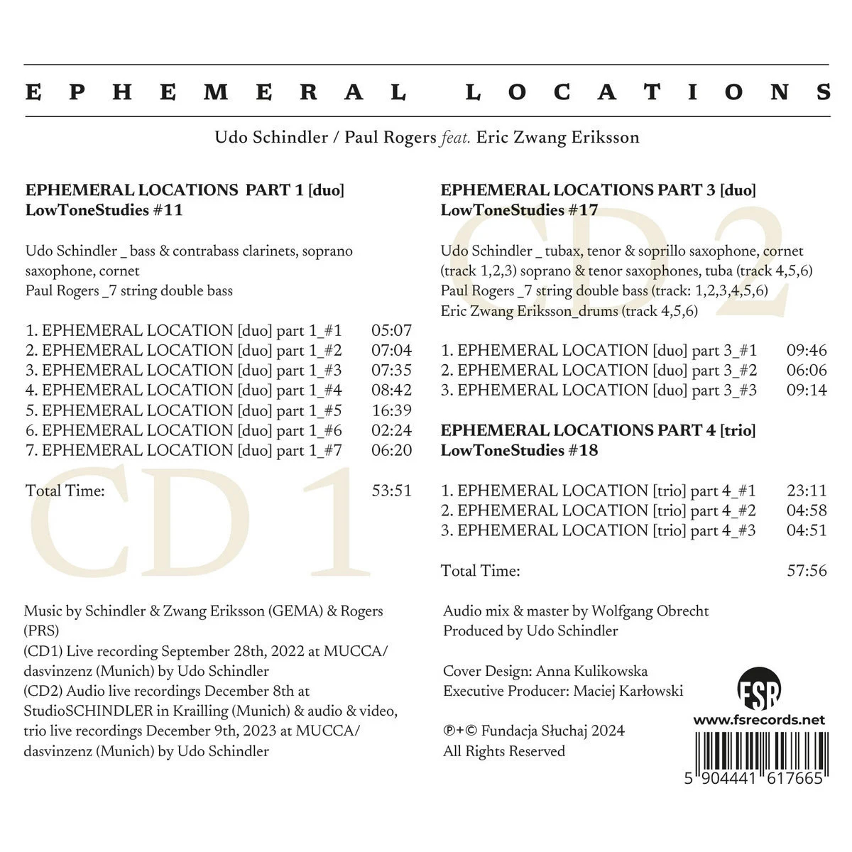 With the double CD album Ephemeral Locations, we add to the list of his collaborators the wonderful magician of the double bass, one of the most original improvisers Paul Rogers and the excellent drummer Erik Zwang Eriksson.