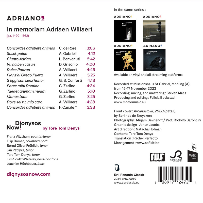 "It has long been my desire to compile a single album of all the many elegies and songs of praise in which Maestro Adriaen Willaert is musically immortalized. In recent years, various musicological articles have been published that shed light on the music that pays tribute to Adriaen Willaert, composed in the period following his death on December 7, 1562. However, recordings and especially performances of most of these works have been lacking until now. All the more reason to fill this 'vacuum'--which, for some works, spans over 400 years--with Dionysos Now!" - Tore Tom Denys