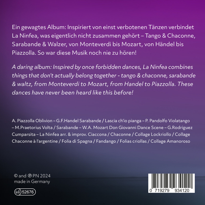 A daring album: Inspired by once forbidden dances, Ensemble La Ninfea combines things that don't actually belong together - tango & chaconne, sarabande & waltz, from Monteverdi to Mozart, from Handel to Piazzolla. These dances have never been heard like this before! This Anniversary Album celebrates 15 years of Ensemble La Ninfea!