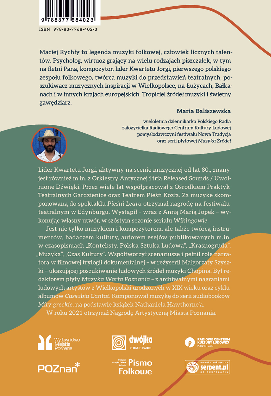 Ksi±¿ka prezentuje jedn± z najoryginalniejszych postaci na polskiej scenie muzycznej. Maciej Rych³y – z wykszta³cenia psycholog – to legenda muzyki folkowej, lider Kwartetu Jorgi, znany równie¿ m.in. z Orkiestry Antycznej i tria Released Sounds / Uwolnione D¼wiêki. Przez wiele lat wspó³pracowa³ z O¶rodkiem Praktyk Teatralnych Gardzienice oraz Teatrem Pie¶ñ Koz³a. Za muzykê skomponowan± do spektaklu Pie¶ni Leara otrzyma³ nagrodê na festiwalu teatralnym w Edynburgu. Wyst±pi³ w serialu Wikingowie. Gra m.in. na fletach i instrumentach pasterskich, jest tak¿e twórc± instrumentów i badaczem kultury.