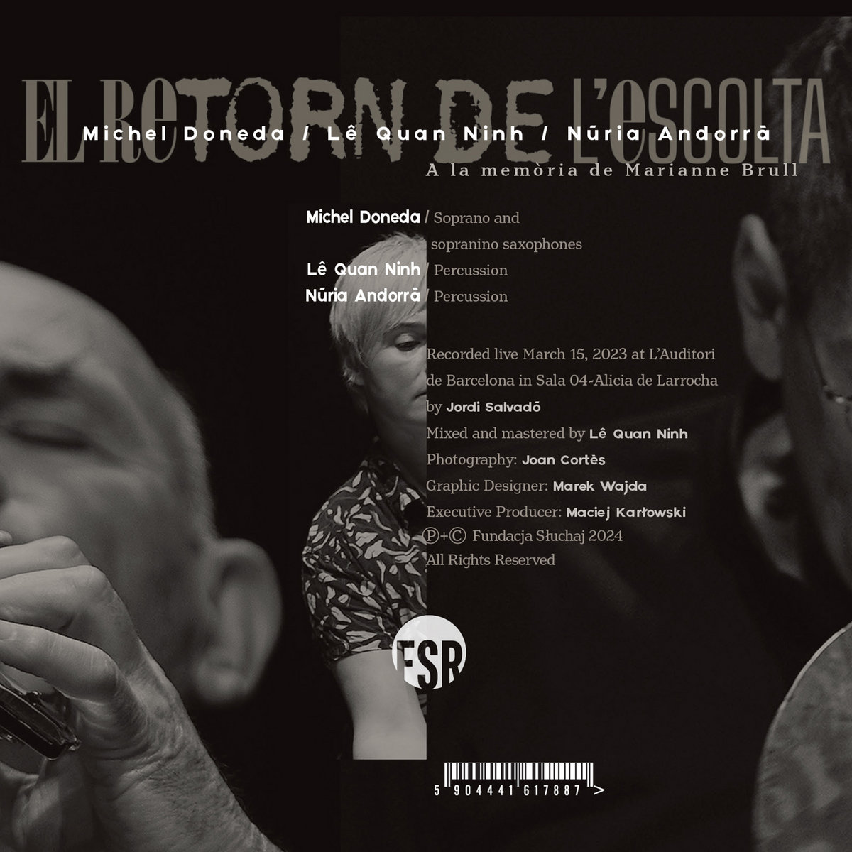 This recording is the document of the concert that took place on March 15, 2023 at L'Auditori de Barcelona in Sala 04-Alicia de Larrocha. It is therefore a document as faithful as possible to what happened that day when for the first time Doneda, Ninh and Andorrà were on stage. Michel Doneda and Lê Quan Ninh, a stable duet for more than thirty years, have set up a space for joint creation based on a radical concept of listening that avoids any extramusical narrative to focus on the conformation of the purely sound. Núria Andorrà, a reference in the Barcelona improvisation scene, joins this saxophone and percussion duo where the instant composition explores the fragility of the moment. Creation takes place at the same time as listening.