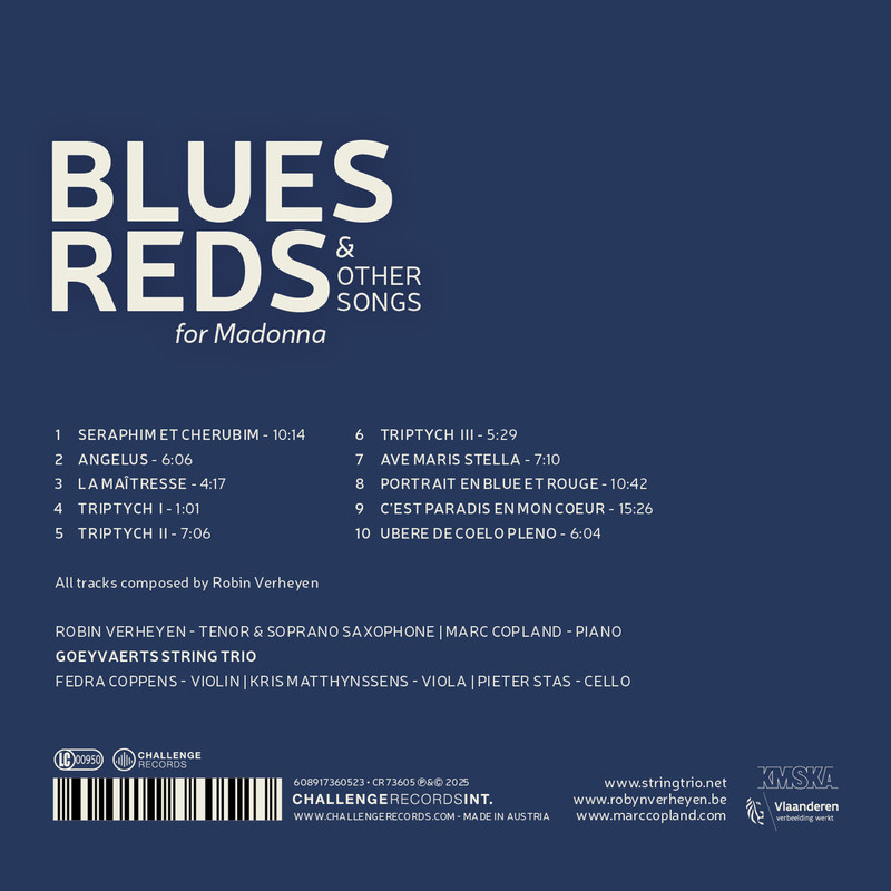 In this day and age, who still writes love songs for a chosen woman of yesteryear? With sounds that whistle deep blue and remind you of the blues - the origins of jazz? - in his new composition Robin Verheyen takes colors from Jean Fouquet’s ‘Madonna’ and assigns them to his tenor and soprano, the three musicians of the Goeyvaerts String Trio and the 88 keys of Marc Copland’s piano.