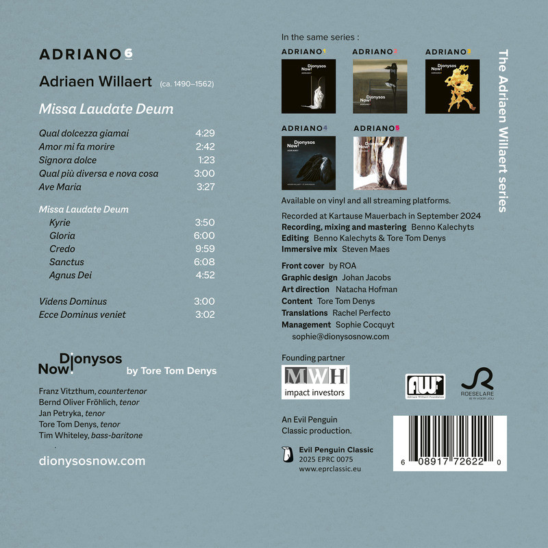 The album Adriano 6 by Dionysos Now! Pays tribute to Adriaen Willaert (1490–1562). The centerpiece of this recording is the Missa Laudate Deum, a so-called parody mass based on Johannes Mouton’s motet of the same name. This remarkable mass showcases Willaert’s masterful command of polyphony and serves as an homage to his mentor. The Missa Laudate Deum comes from the rare Liber quinque missarum (1536), a collection of five masses where Willaert demonstrates his refined continuation of the Parisian School. By integrating Mouton’s hymn of praise with his own innovations, Willaert created a masterpiece that remains a milestone in the history of mass composition.