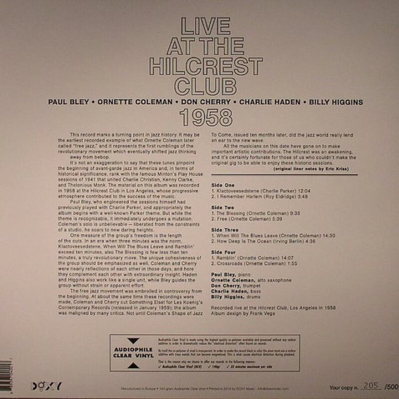 Live at the Hilcrest Club 1958 (originally released in 1970 by America Records as The Fabulous Paul Bley Quintet) is a live album by pianist Paul Bley, saxophonist Ornette Coleman, trumpeter Don Cherry, drummer Billy Higgins and bassist Charlie Haden recorded in California in 1958 and released on the Inner City label in 1976.
