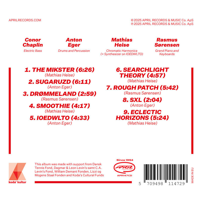 Denmark’s premiere outlet for forward-thinking modern jazz, April Records proudly presents the debut of a brand new quartet featuring some of Scandinavia and the UK’s most celebrated instrumentalists: Mathias Heise, Anton Eger, Rasmus Sørensen and Conor Chaplin.
