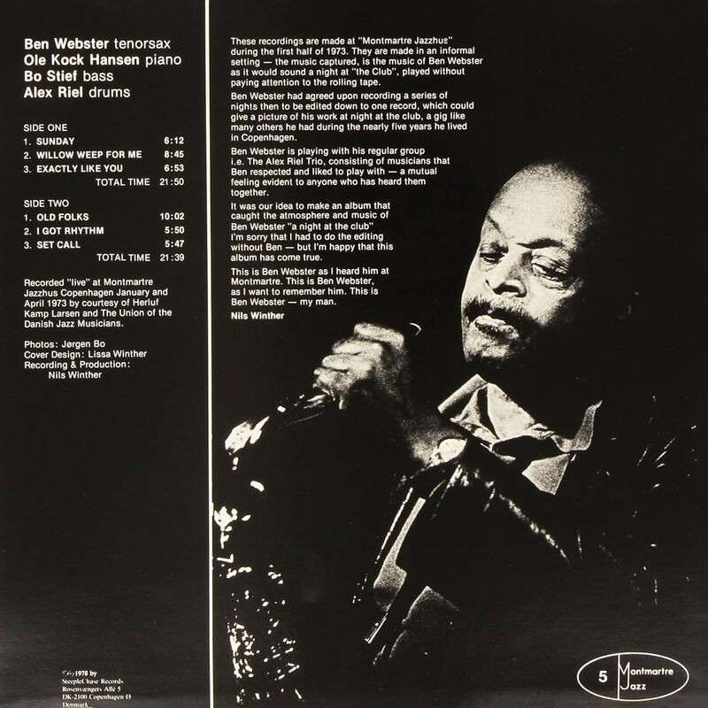 Just months before his death, the great tenor Ben Webster shows that even with an occasional shortness of breath, he never really declined musically. The six selections (five standards and his "Set Call") are all familiar (one wonders how many times Webster recorded "Sunday") but he still sounds enthusiastic and emotional. Joined by pianist Ole Kock Hansen, bassist Bo Stief and drummer Alex Riel for these appearances at the Montmartre in Copenhagen, Webster's warm ballad renditions and hard-driving romps are as always quite enjoyable to hear.