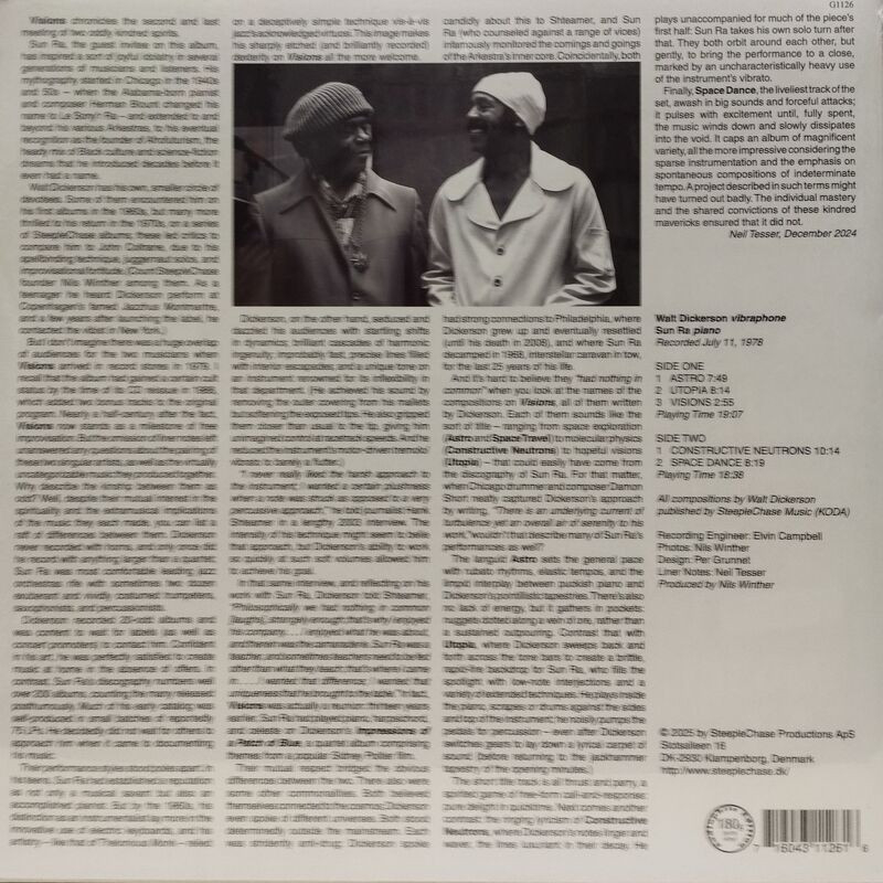 A largely overlooked duo improv date recorded on July 11, 1978, by the Danish jazz impresario Nils Winther, Visions matches Walt Dickerson's cool vibes with Sun Ra's idiosyncratic piano in a way that shows both men's contrasting styles to surprisingly cohesive effect. This was not the first time Dickerson and Ra had recorded together; producer Tom Wilson had used the duo on the soundtrack of the 1966 film Impressions on a Patch of Blue.