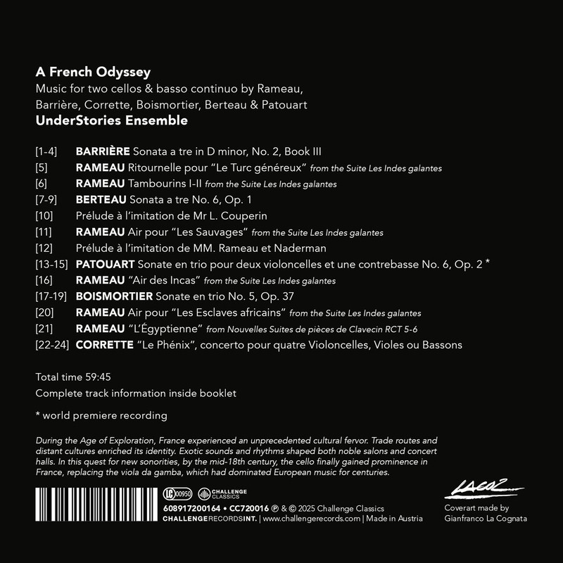 The emphasis on deep sonorities is the culmination of this recording, featuring compositions by Louis-François-Joseph Patouart and Martin Bertin. The latter’s story is particularly significant, embodying the spirit of the recording: he founded the French cello school, despite having started his career with the viola da gamba.