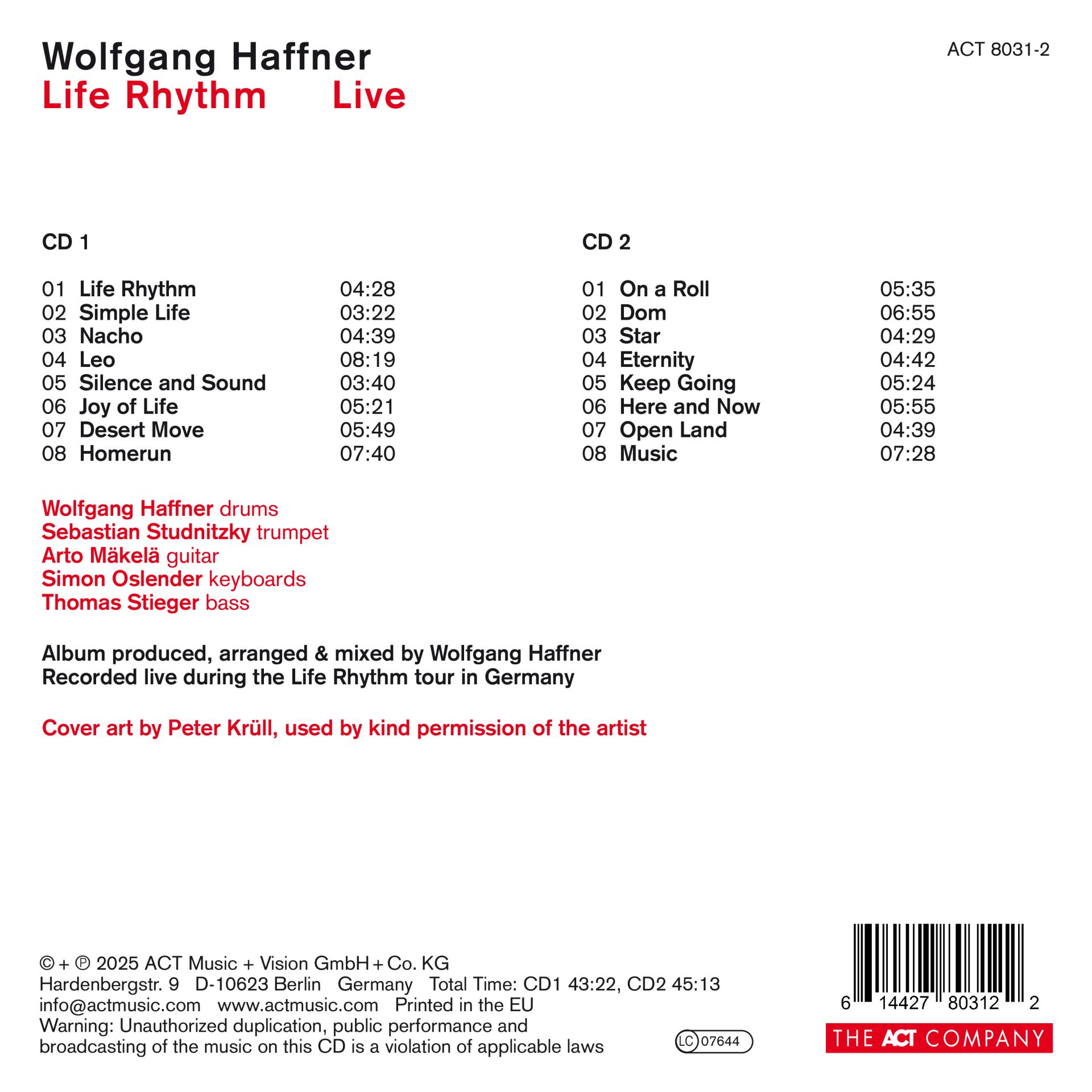 Wolfgang Haffner is one of the most in-demand musicians in European jazz and certainly its most successful drummer-bandleader. He has the kind of full-on schedule in which a series of concerts in Japan can segue straight into an extensive European tour... followed by a short stop-off for a meeting in Ingolstadt – where he’s now in his second year in charge of the programming of the Ingolstädter Jazztage festival – and then off again. Wolfgang Haffner has brought about a remarkable transformation in his career. He has emerged from being a figure in the background in bands led by artists such as Al Jarreau, Jan Garbarek and Nils Landgren, into the kind of bandleader who really sets the tone; it is a role to which he is particularly well attuned and suited. Furthermore, whereas his studio albums such as the most recent, ‘Life Rhythm’, put a focus on high production values and the careful creation of deeply relaxed flow, the new album ‘Life Rhythm - Live’ has not only captured all that finesse and deep craft, it also conveys the kicking energy and dynamic buzz of Haffner's live concerts. The album also demonstrates why – uniquely – concerts by Wolfgang Haffner consisting solely of his own music in the largest concert halls are always sold out in advance.