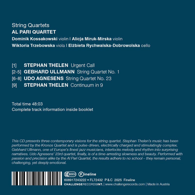 String Quartets brings together three visionary composers—Stephan Thelen, Gebhard Ullmann, and Udo Agnesens—in a compelling exploration of contemporary string quartet writing. Performed with striking intensity and nuance by the Al Pari Quartet, this album spans a landscape of sonic textures, rhythmic complexity, and deeply personal expression.